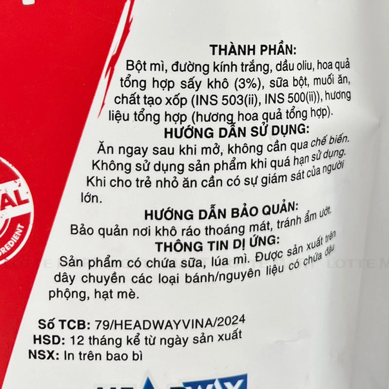 - Thông tin dị ứng: Sản phẩm có chứa sữa, lúa mì. Được sản xuất trên dây chuyền các loại bánh/nguyên liệu có chứa đậu phộng, hạt mè.