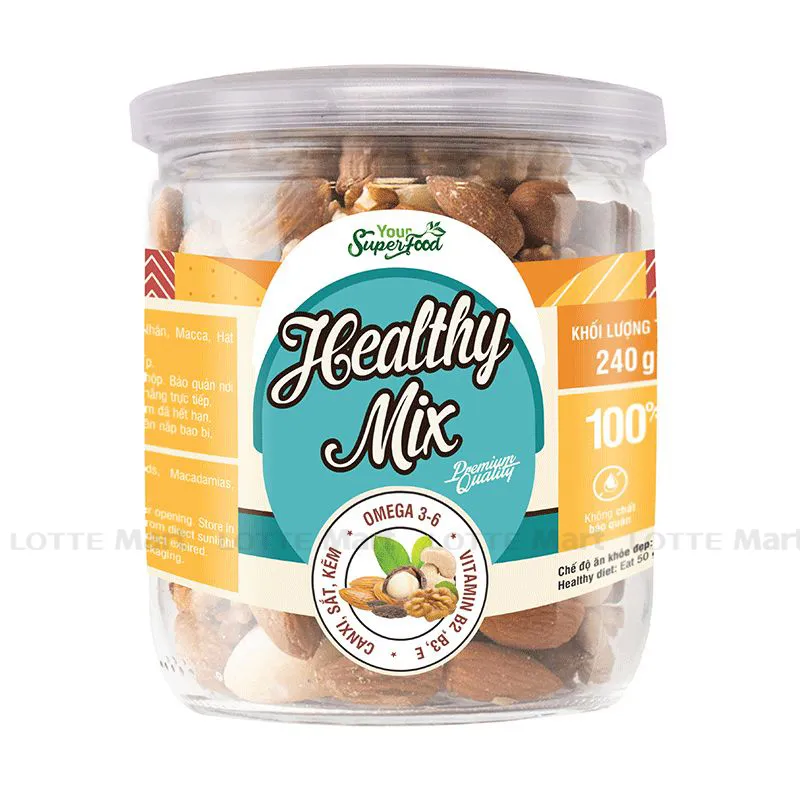 Healthy Mix Your Super Food kết hợp giữa vị giòn tan, béo thanh của óc chó, bùi thơm của hạnh nhân, béo mịn của macca, béo ngọt của hạt điều với vị dẻo mịn, ngọt dịu của nho Úc Organic, rất ngon miệng khi thưởng thức.