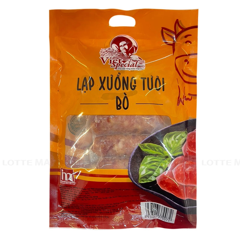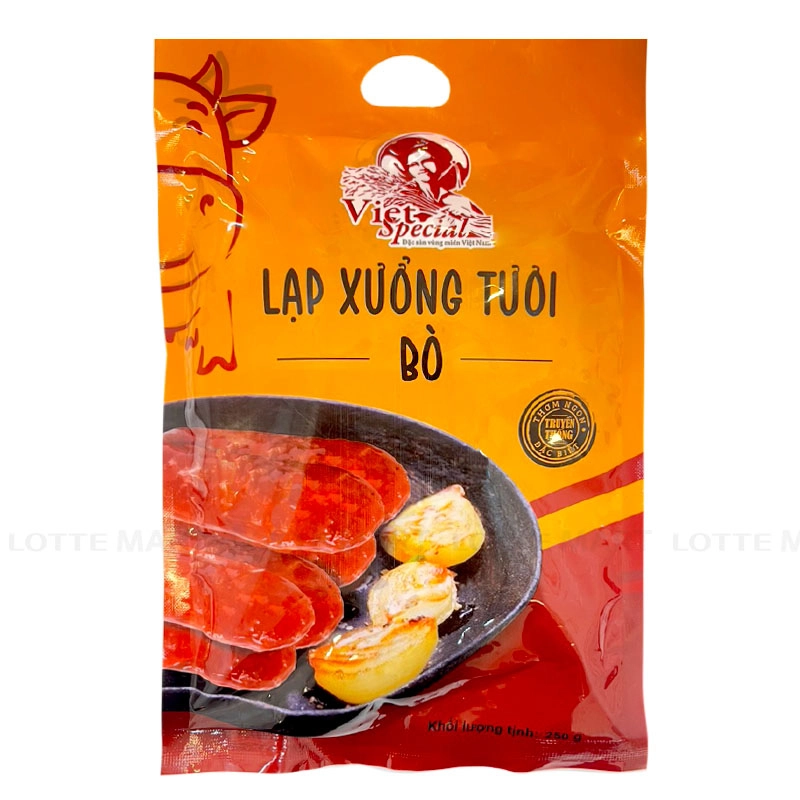 Thành phần: 50% thịt bò, mỡ heo, đường, muối,tiêu hột, tỏi, rượu thơm, ruột heo non, chất điều vị Mononatri glutamate (621), Chất bảo quản Natri nitrit (249).