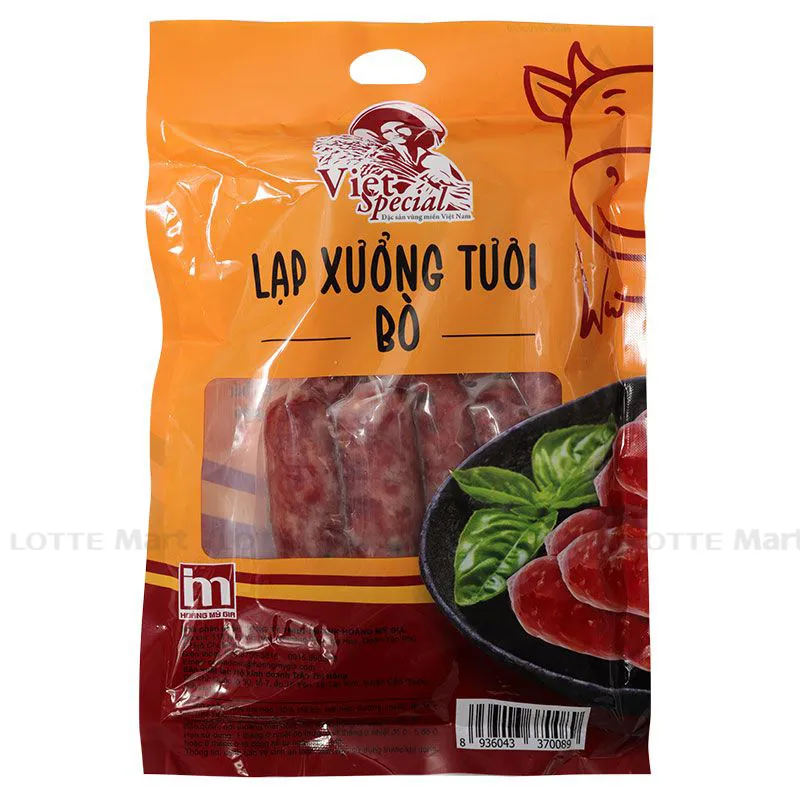 Thành phần: 50% thịt bò, mỡ heo, đường, muối,tiêu hột, tỏi, rượu thơm, ruột heo non, chất điều vị Mononatri glutamate (621), Chất bảo quản Natri nitrit (249).Luộc chín và chiên lại bằng mỡ hoặc dầu ăn.Bảo quản 1 tháng ở nhiệt độ thường, 2 tháng ở tủ lạnh kể từ ngày sản xuất.