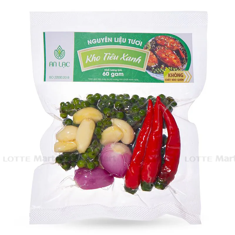 Hỗn hợp nguyên liệu tươi kho tiêu An Lạc 60g gồm tiêu xanh, tỏi, ớt, hành tím, được làm sạch, đóng gói hút chân không tiện lợi, không chứa chất bảo quản, đảm bảo an toàn vệ sinh thực phẩm.