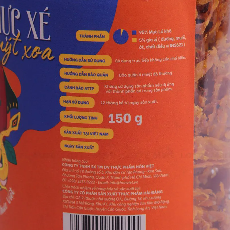 - Khô Mực Xé Cay Xuýt Xoa Hồn Việt 150g có thành phần chính 90% mực, 10% gia vị: đường, muối, chất bảo quản,...