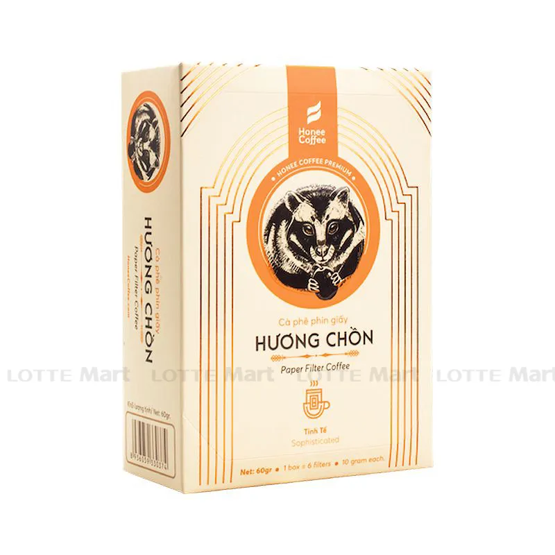 Cà Phê Phin Giấy Honee Coffee Hương Chồn Tinh Tế với hương vị chồn mộc mạc, hoang dã và độc đáo. được tạo ra với mục đích lưu giữ lại hương vị của huyền thoại cà phê Chồn Việt Nam. Dựa trên cảm nhận đối với cà phê Chồn và kiến thức về cà phê, chúng tôi đã kết hợp hai loại cà phê đặc trưng của Tây Nguyên - Robusta của Đăk Lăk và Arabica của Lâm Đồng - cùng với kĩ thuật rang riêng biệt để tạo nên giá phòng ngừa thưởng thức của sản phẩm.