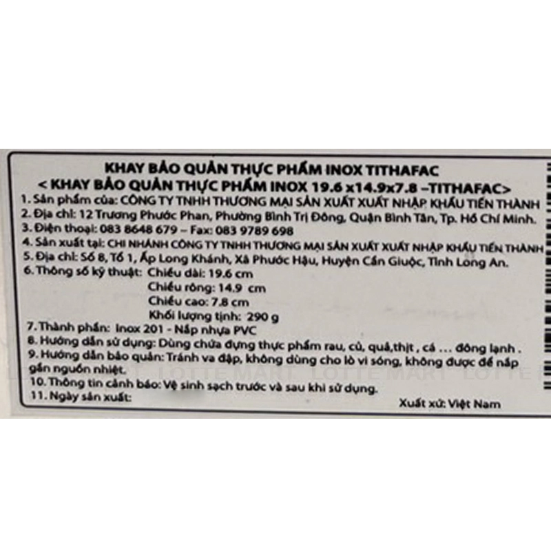 Khay Bảo Quản Thực Phẩm Inox Cao Tithafac 2L