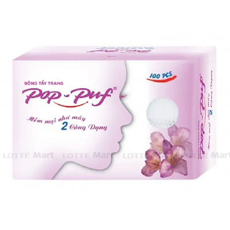 - Bông Tẩy Trang Pop-Puf 100 Miếng được làm từ chất liệu Cotton với các sợi bông dài có kết cấu chặt chẽ, ép biên xung quanh, không bị xù lông, rút sợi, không gây trầy xước hoặc tổn thương daBông có thiết kế độc đáo với một mặt bằng bông, mặt còn lại bằng vải không dệt được sử dụng cho 2 mục đích: Dưỡng da và tẩy trang.