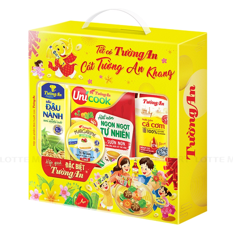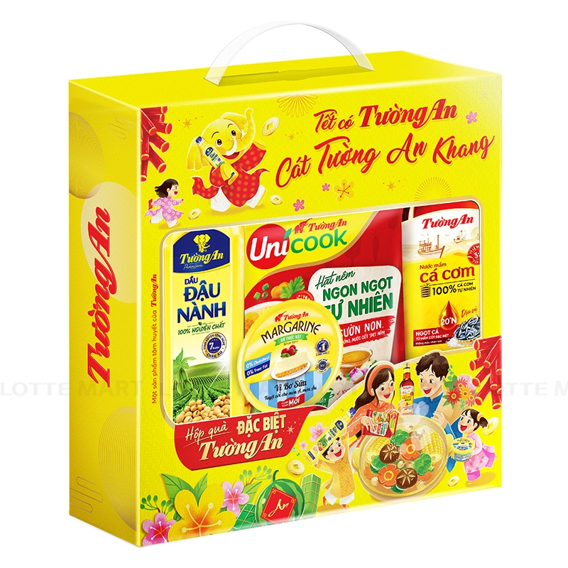 - Hộp Quà Dầu Đậu Nành Tường An Thượng Hạng là món quà Tết ý nghĩa dành tặng gia đình và bạn bè, với bộ 4 sản phẩm gia vị chất lượng: Dầu Đậu Nành Tường An Premium 1L, Bơ Tường An Margarine Vị Bơ Sữa 80g, Nước Mắm Cá Cơm Tường An 20 Độ Đạm - Dịu Vị 500ml, Hạt Nêm Ngon Ngọt Tự Nhiên Tường An Unicook Sườn Non Xương Ống và Nước Cốt Thịt Hầm 400g.