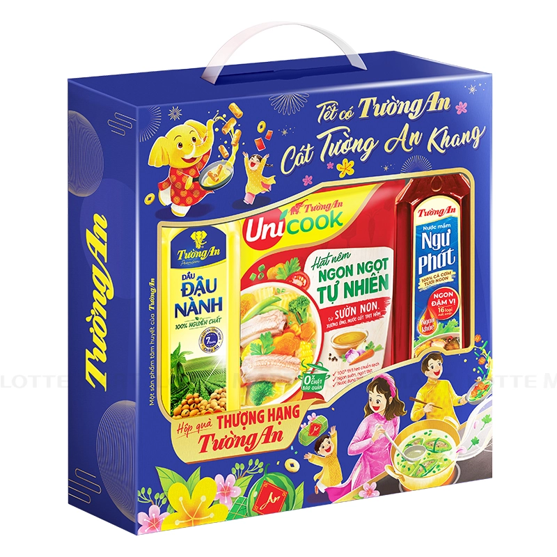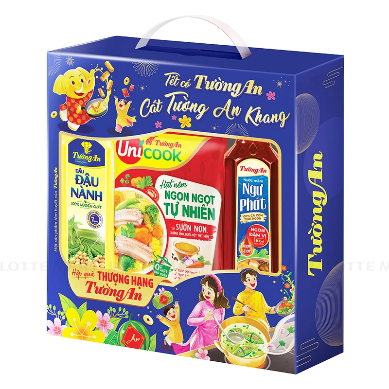 - Hộp Quà Dầu Đậu Nành Tường An Thượng Hạng là món quà Tết ý nghĩa dành tặng gia đình và bạn bè, với bộ 3 sản phẩm gia vị chất lượng: Dầu Đậu Nành Tường An Premium 1L, Nước mắm Ngư Phát - Ngon Đậm Vị (Nhãn Xanh) 750ml, Hạt Nêm Ngon Ngọt Tự Nhiên Tường An Unicook Sườn Non, Xương Ống và Nước Cốt Thịt Hầm 400g.