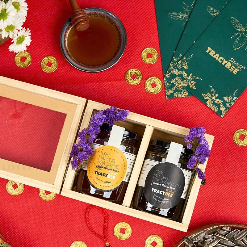 Hộp Quà Gỗ Đôi Nhỏ Tracybee Mật Ong Hoa Chôm Chôm 189ml Và Mật Ong Hoa Cà Phê 189ml