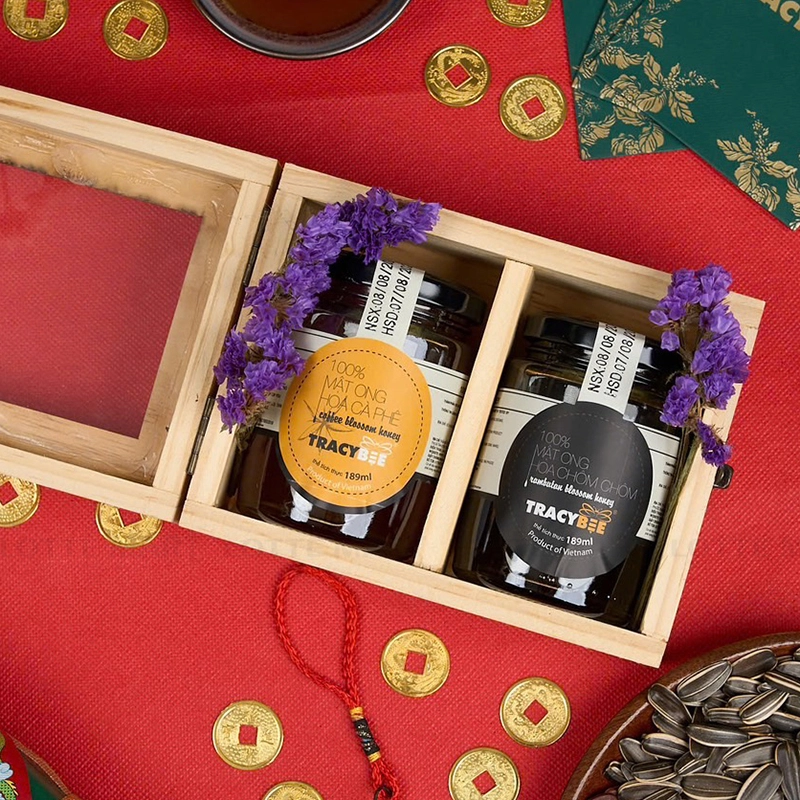 - Hộp Quà Tracybee Mật Ong Hoa Chôm Chôm và Hoa Cà Phê là một món quà Tết mang đậm phong cách sang trọng và tinh tế.