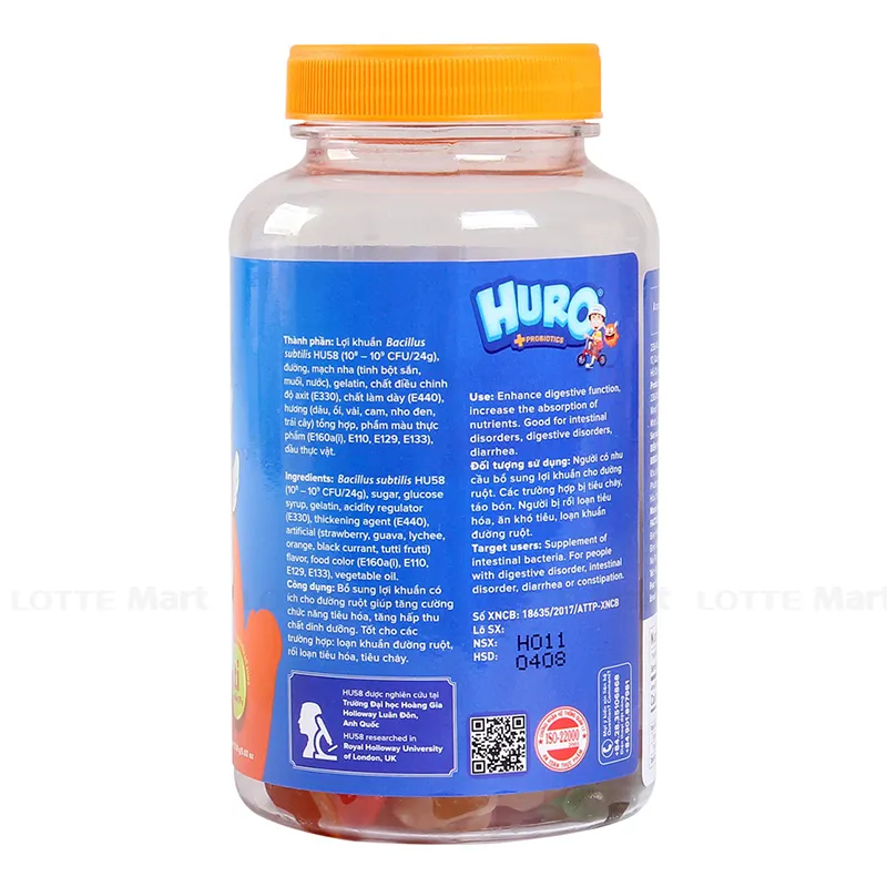 - Kẹo Dẻo Lợi Khuẩn Huro Hũ 168g là sản phẩm kẹo dẻo đầu tiên có mặt tại Việt Nam chứa 1 tỉ lợi khuẩn HU58 - kết quả ra đời từ nghiên cứu của giáo sư Simon Cutting tại một Đại học ở Luân Đôn, Anh Quốc - có tác dụng kích thích hoạt động đường ruột nhờ sản sinh ra một lượng lớn men vi sinh giúp tiêu hóa thức ăn dễ dàng và tối ưu hấp thu dinh dưỡng.