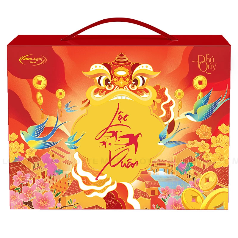 - Hộp Quà Tết Lộc Xuân Phú Quý gồm các loại bánh kẹo khác nhau bên trong và túi xách bằng giấy cùng thiết kế bên ngoài. Cái loại bánh kẹo được đặt bên trong chiếc hộp giấy màu đỏ sang trọng và tinh tế làm cho sản phẩm trở nên ý nghĩa hơn khi dùng để làm quà tặng cho người thân, bạn bè và đối tác.