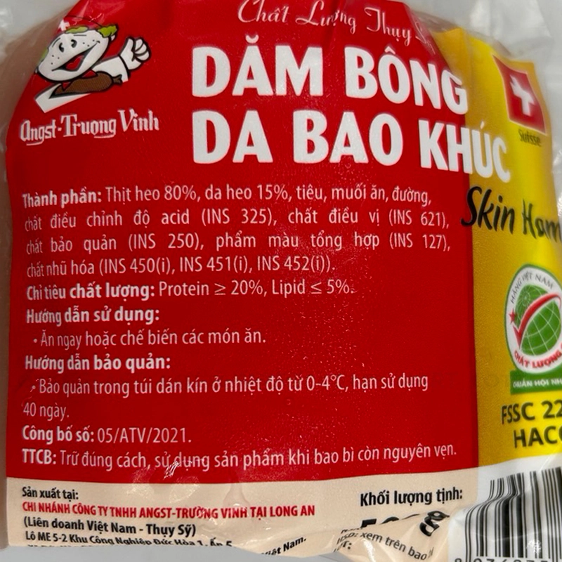 - Thịt heo 80%, da heo 15%, tiêu, muối ăn, đường, , chất điều chỉnh độ acid (INS 325), chất điều vị (INS 621), chất bảo quản (INS 250), phẩm màu tổng hợp (INS 127), chất nhũ hóa (INS 450 (i), INS 452 (i)).