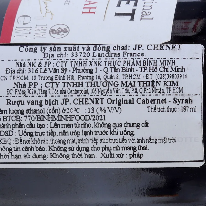 - Rượu Vang Syrah JP Chenet 13% ABV Chai 187ml được lên men từ những trái nho Syrah, Cabernet Sauvignon, vang ngọt ngào tinh tế bởi lẽ sự pha trộn hài hoà hương vị của những trái nho ấy. Hương thơm của chúng còn bung toả sâu sắc ngọt ngào từ hương vị của việt quất, dâu rừng, anh đào, hạnh nhân hay bạch đậu khấu…