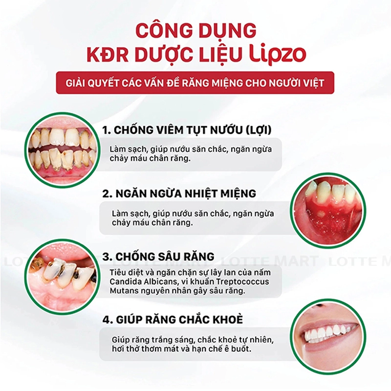 - Kem Đánh Răng Dược Liệu Lipzo Gum Protect với thành phần chiết xuất dược liệu giúp ngừa bệnh viêm nướu, giúp nướu chắc khỏe, phòng ngừa chứng tụt nướu. Sản phẩm giúp làm sạch các mảng bám mà không hề làm mòn men răng.