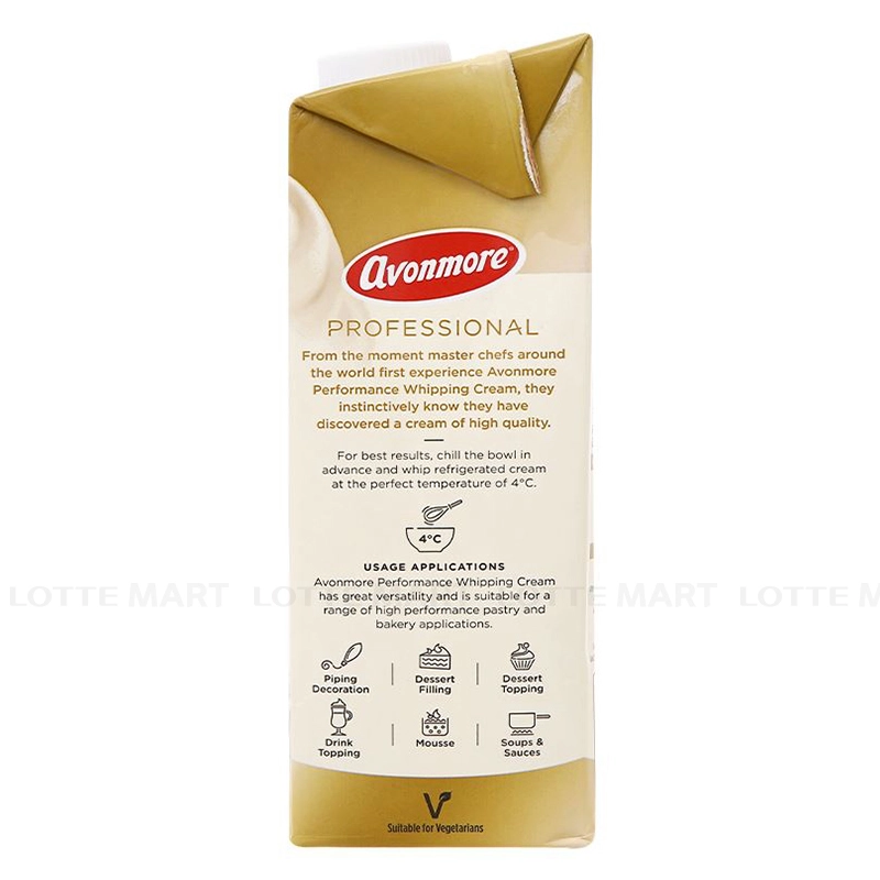 - Kem Avonmore Whipping Hộp 1L được làm từ 100% được làm từ nguồn sữa bò tuyển chọn với độ béo cao lên đến 35.1% giúp những món bánh của bạn thêm phần thơm ngon hơn.
