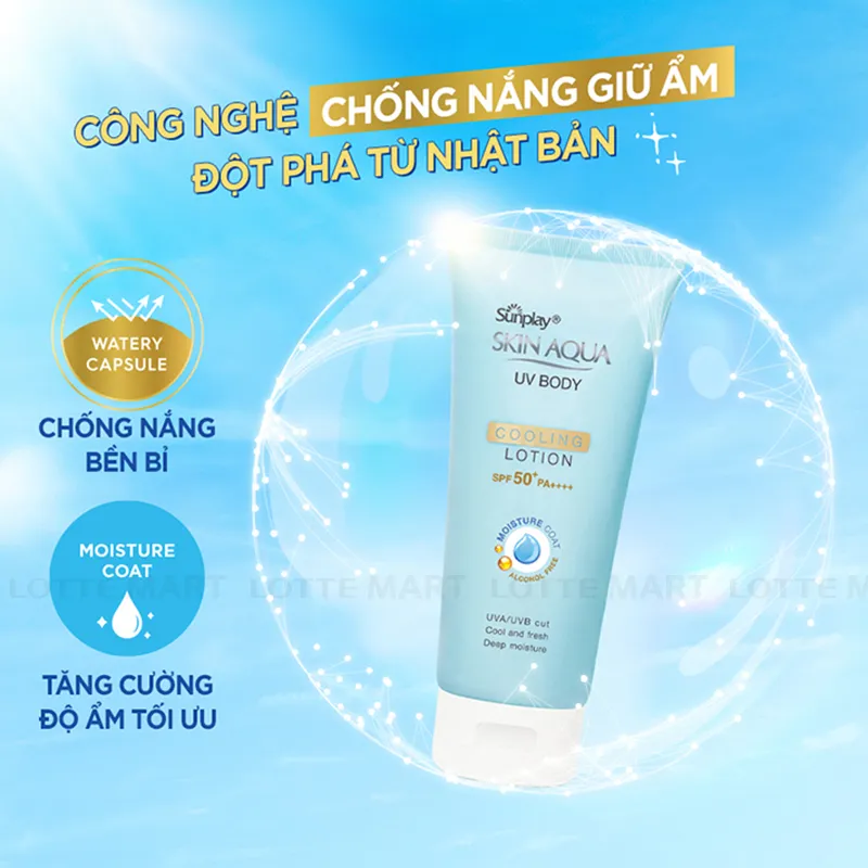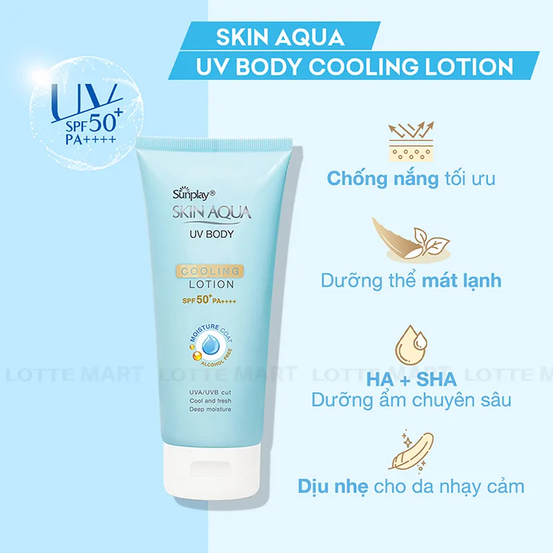 - Với chất sữa nhẹ tênh, thấm nhanh và không nhờn rít cho da thoáng mịn suốt ngày dài, không làm bí bách da. Lotion chống nắng dưỡng thể Sunplay Skin Aqua UV Body Cooling Lotion 150g không chứa cồn, không gây khô da, dịu nhẹ cho da nhạy cảm, không gây kích ứng. Có thể dùng làm lớp lót trang điểm. Sản phẩm có hương thơm trái cây dịu nhẹ, ngọt ngào nhờ thành phần chứa chiết xuất các loại hoa quả tự nhiên như: dưỡng thể mát lạnh chứa chiết xuất nha đam và trà xanh giải nhiệt giúp làm dịu da, phục hồi da hư tổn do nắng.