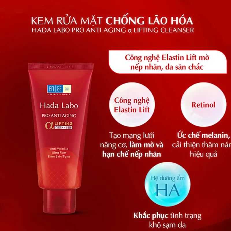 - Kem Rửa Mặt Hada Labo Dưỡng Chuyên Biệt Ngừa Lão Hóa 80G là sữa rửa mặt ngoài tác dụng làm sạch sâu và cấp ẩm cho da còn nổi bật Elastin Lift chứa Elastin và Collagen cùng 3D HA tạo mạng lưới nâng cơ, giúp làm mờ, hạn chế nếp nhăn, cùng với Retinol giúp giảm sự hình thành hắc tố melanin, cải thiện thâm nám hiệu quả thuộc thương hiệu Hada Labo đến từ Nhật Bản.