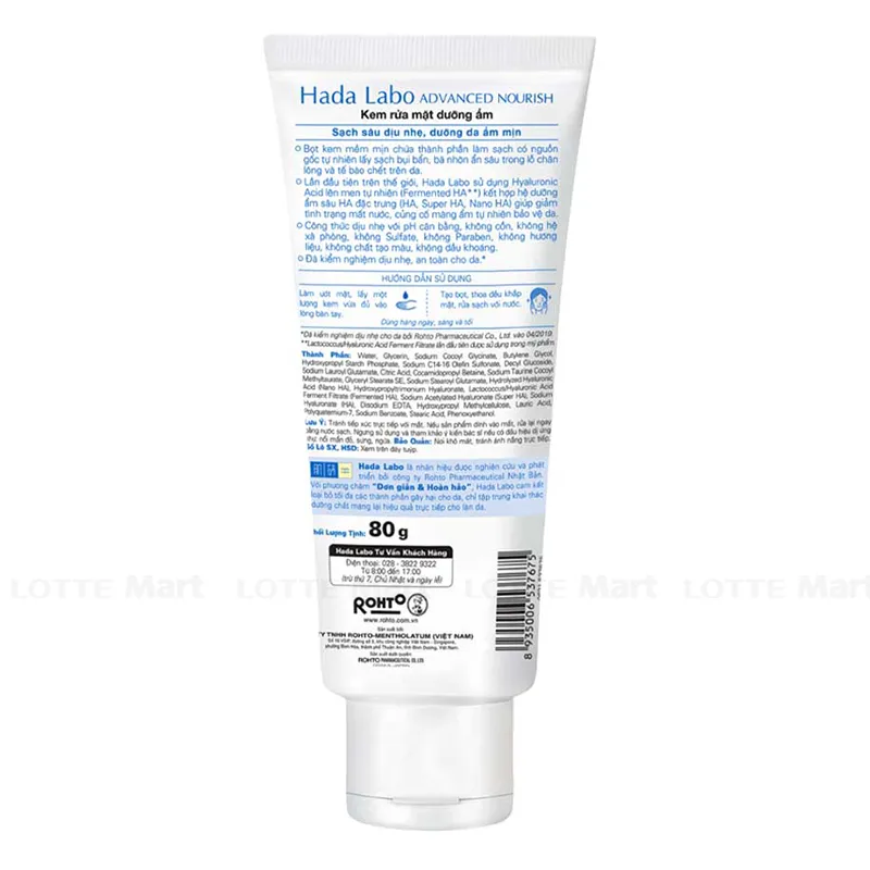 - Kem rửa mặt dưỡng ẩm Hada Labo Advanced Nourish Cream Cleanser tạo bọt mịn, nhẹ nhàng rửa sạch lớp tế bào chết, bụi bẫn, bã nhờn ẩn sâu trong lỗ chân lông, giúp da sạch, mềm mại, tươi mới.