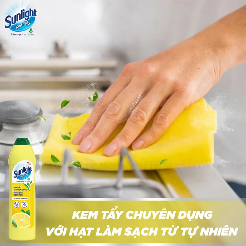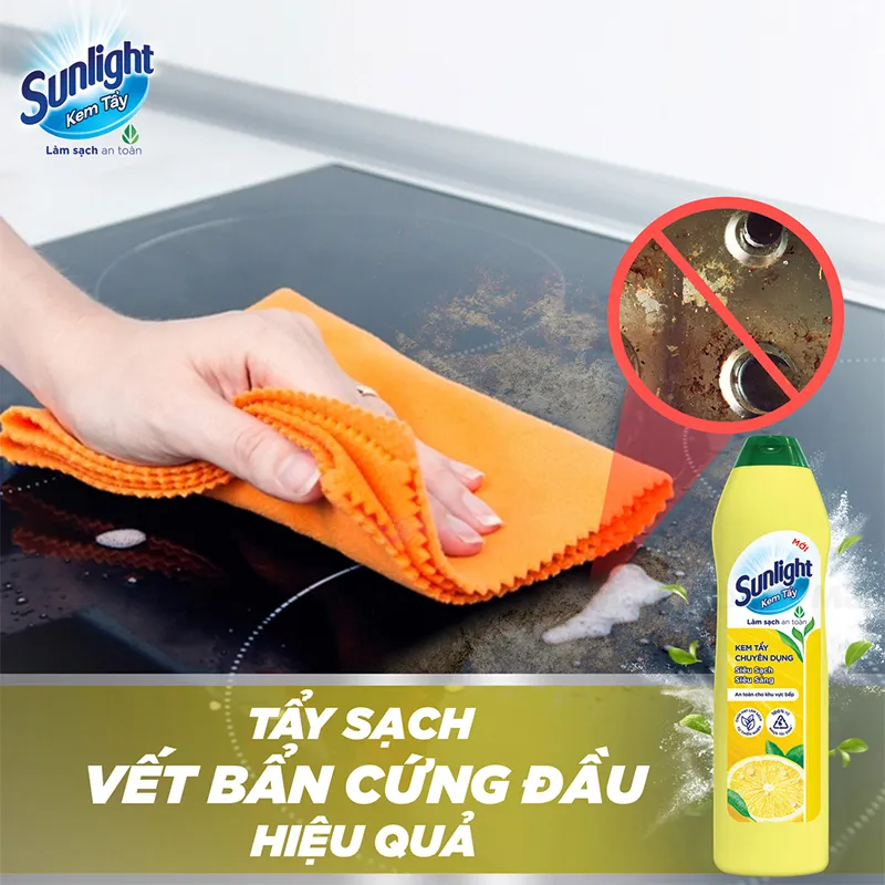 - Kem Tẩy Sunlight Chuyên Dụng Siêu Sạch Siêu Sáng 690g sẽ giúp việc tẩy rửa, đặc biệt là lau bếp trở nên dễ dàng và nhanh chóng. Kể cả nhiều loại vết bẩn khó tẩy như: vết gỉ sét trên bếp ga, vết bám lâu ngày trên lò vi sóng hay máy hút mùi. Nhờ đó, luôn giữ cho ngôi nhà bạn được sạch sẽ, sáng bóng.