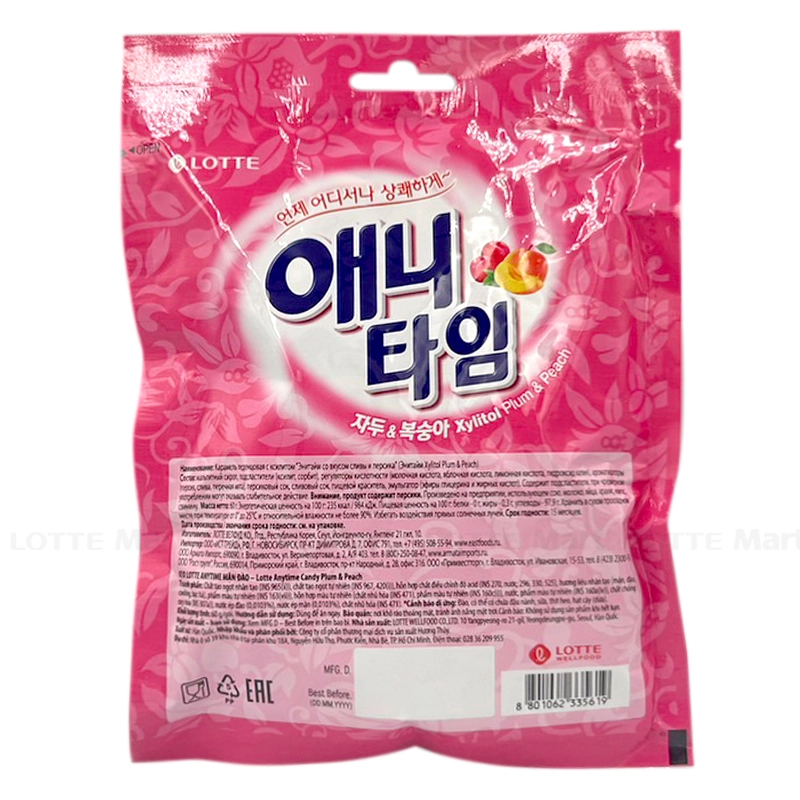- Kẹo Lotte Anytime Xylitol Vị Mận Và Đào với những viên kẹo mang vị thanh ngọt, thơm mát của bạc hà cùng hương mận, đào, cho bạn cảm giác thật sảng khoái. Với vị ngọt hài hòa, sản phẩm chính là cầu nối giúp bạn chia sẻ những khoảnh khắc ngọt ngào cùng những người thân yêu.