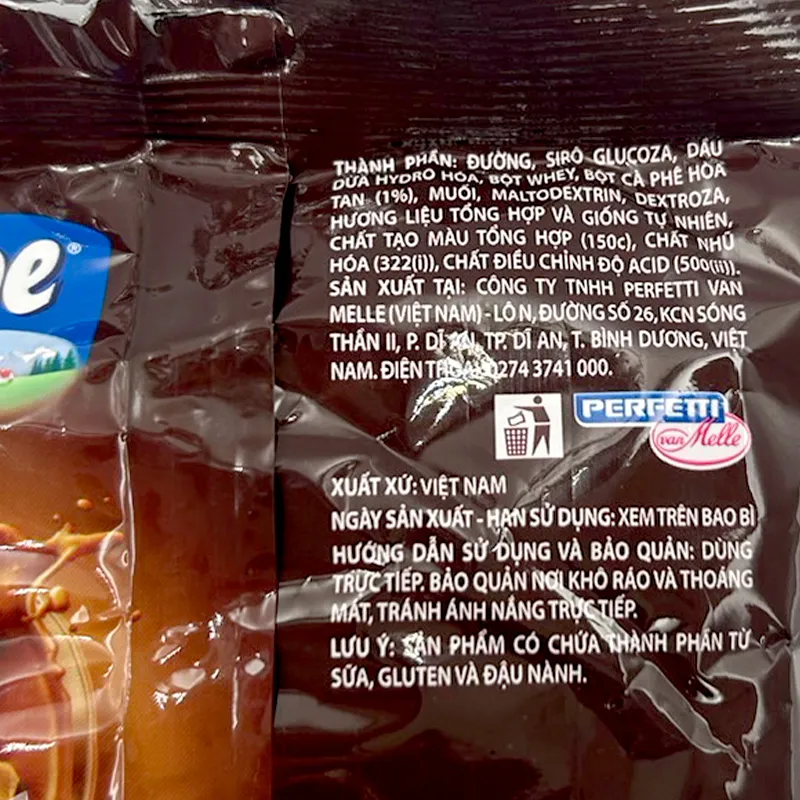 - Đường, bột kem thực vật, dầu thực vật, chất ổn định, bột kem sữa, hương muối tổng hợp, hương cà phê, màu thực vật, chất tạo ngọt,..
