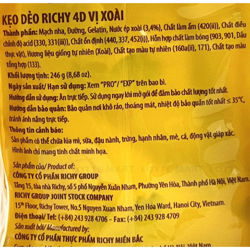 Kẻo Dẻo Xoài 4D Richy với từng viên kẹo được thiết kế mô phỏng hình trái xoài sinh động, mang đến cảm giác thú vị và bắt mắt ngay từ cái nhìn đầu tiên.