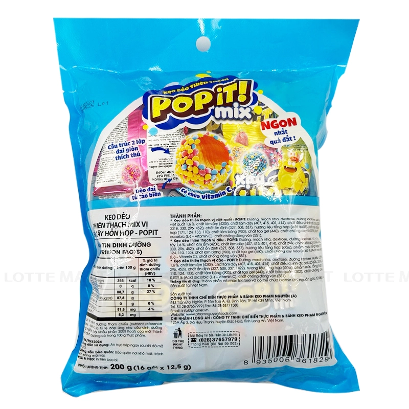 - Kẹo Dẻo Thiên Thạch Pop It Mix Gói 200G có 3 loại kẹo thơm ngon hấp dẫn gồm: Kẹo Dẻo Thiên Thạch Vị Việt Quất, Kẹo Dẻo Thiên Thạch Vị Dâu, Kẹo Dẻo Thiên Thạch Vị Đào, mang lại sự đa dạng và thú vị trong mỗi gói kẹo.