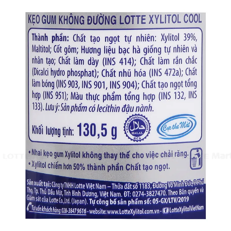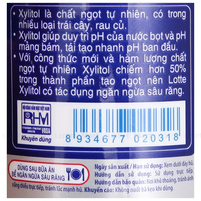 Kẹo gum Xylitol đã được chứng minh có thể ngăn ngừa sâu răng. Và cách hiệu quả nhất là nhai 2 viên kẹo gum có chứa Xylitol của Lotte sau mỗi bữa ăn. Bảo quản: Bảo quản nơi khô thoáng, tránh ánh nắng trực tiếp. Nơi sản xuất: Việt Nam.