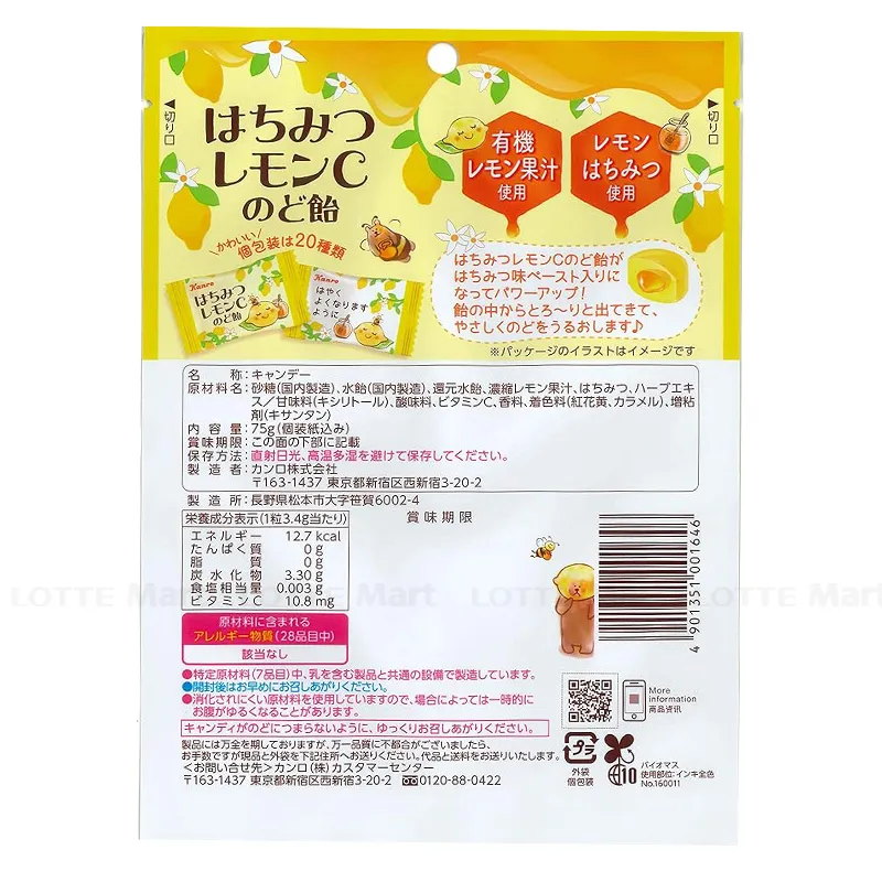 - Kẹo Ngậm Thông Họng Kanro Vị Chanh Mật Ong là sự kết hợp giữa nước ép chanh cô đặc, mật ong và các thảo mộc khác, sản phẩm kẹo mật ong chanh Kanro Honey Lemon giúp thông cổ, giảm ho, giảm đau rát họng hiệu quả, được người sử dụng tin dùng. Sản phẩm giúp bạn nhanh chóng lấy lại được giọng nói, cảm giác dễ chịu, thoải mái.