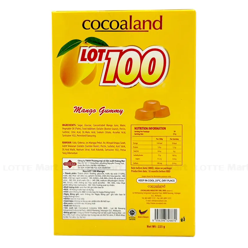 - Kẹo Lot100 Vị Xoài Hộp 225G được chế biến hoàn toàn bằng nguồn nguyên liệu sạch, tự nhiên trên dây chuyền sản xuất hiện đại, do đó kẹo dẻo vị xoài Lot 100 vẫn giữ được hương vị thơm ngon, ngọt ngào của những quả xoài chín cây như nó vốn có. Kẹo mềm mềm, dẻo dẻo, ăn vào có vị ngọt dịu chứ không quá gắt như nhiều loại kẹo khác, sẽ khiến bạn có cảm giác như đang ăn xoài thật vậy. Hơn nữa, kẹo Lot 100 vị xoài còn chứa vitamin C, mang đến nhiều lợi ích cho sức khỏe của bạn.