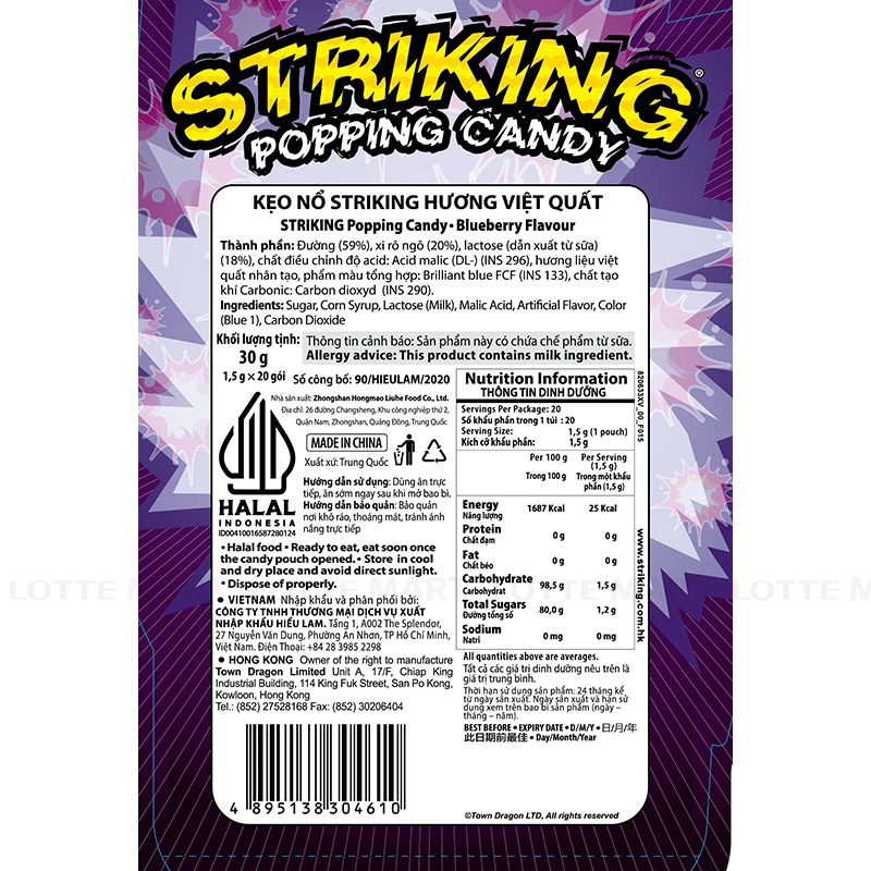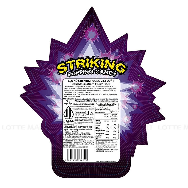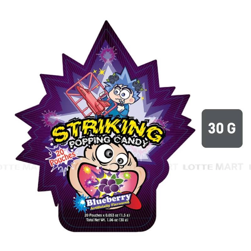 - Kẹo Nổ Striking Việt Quất 30G là một trong những loại kẹo yêu thích của các bé và đôi khi là cả người lớn, những tiếng nổ bôm nốp vui miệng cùng hương vị chua chua ngọt ngọt là đáng nhớ hơn hết.