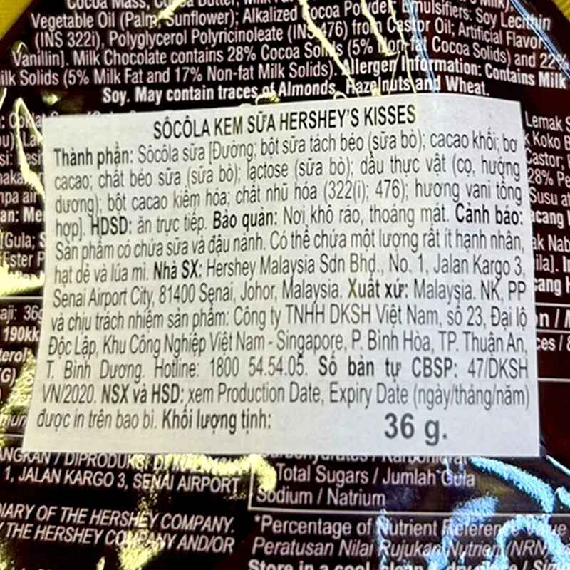 Kẹo Sô Cô La Kem Sữa Kisses Hershey'S Gói 36G