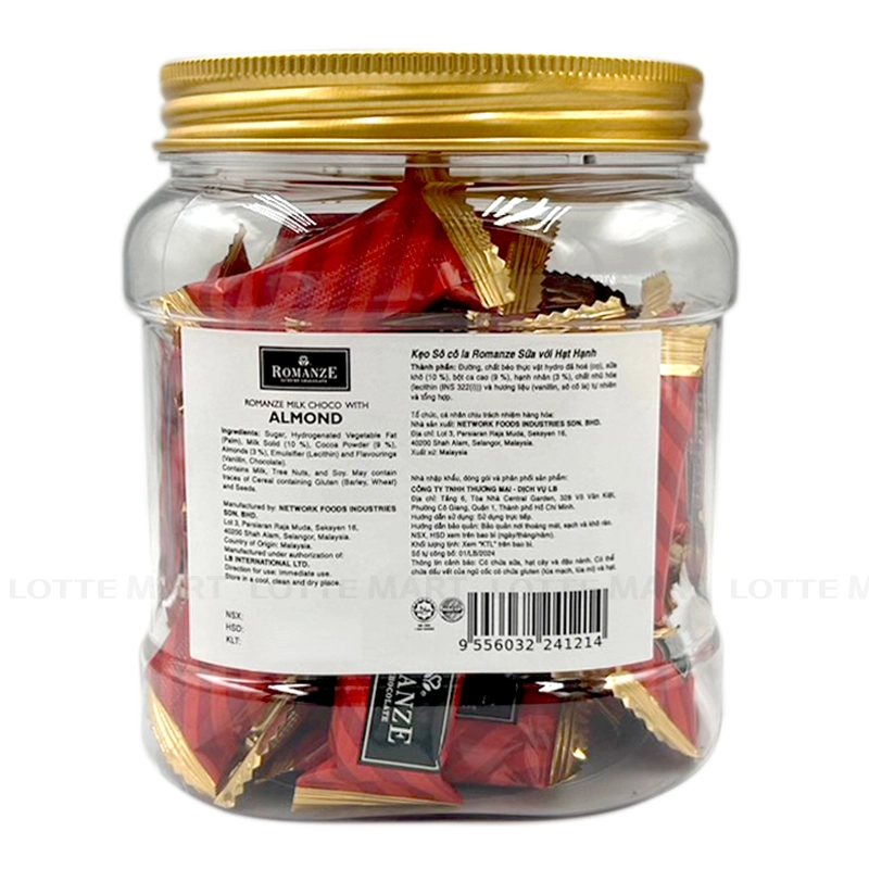 - Kẹo Socola Romanze Sữa Hạnh Nhân được làm từ nguồn nguyên liệu hảo hạng, sản xuất trên dây chuyền công nghệ hiện đại của Malaysia. Mỗi viên kẹo là sự kết hợp hoàn hảo giữa hương vị socola sữa thơm ngon, ngọt ngào và vị bùi giòn của hạt hạnh nhân, mang đến trải nghiệm đầy lôi cuốn.
