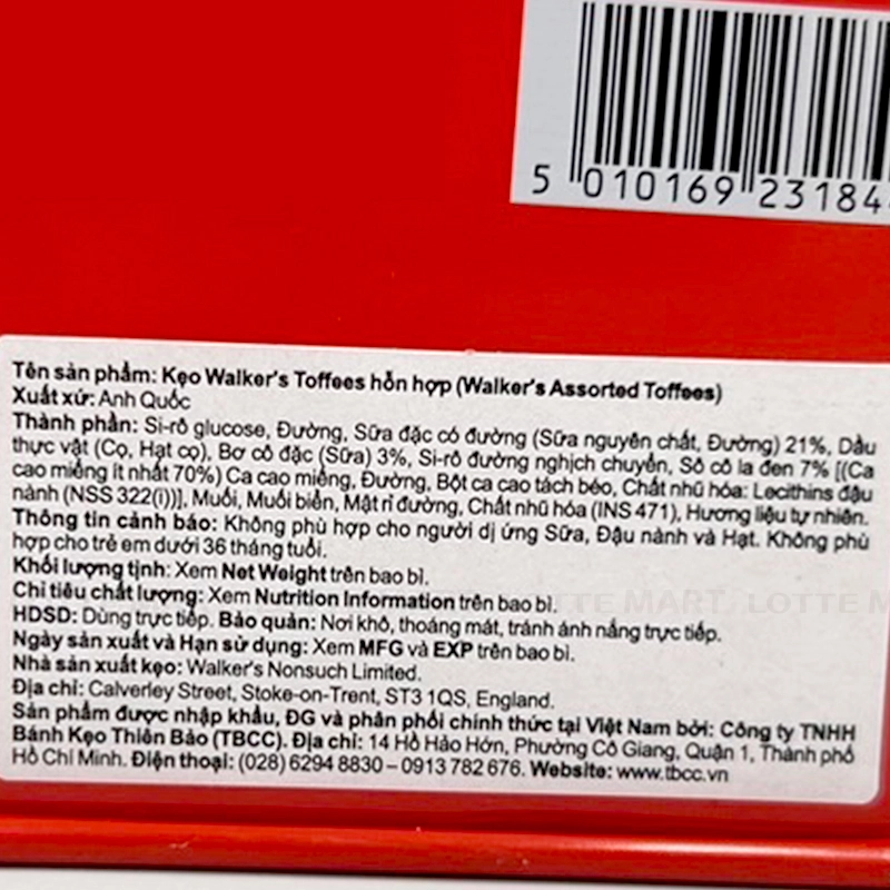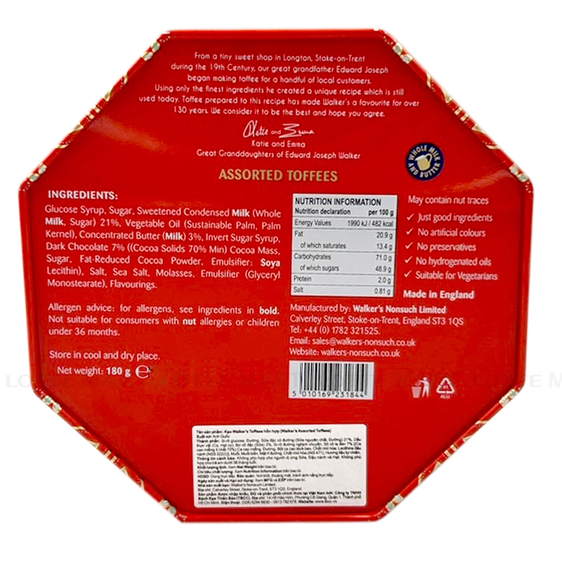 - Hộp thiếc sang trọng chứa những viên kẹo này không chỉ là món quà lý tưởng cho người thân yêu mà còn là sự lựa chọn tuyệt vời để tự thưởng cho mình. Với chất lượng hoàn hảo, thiết kế đẹp mắt và hương vị đặc trưng, Kẹo Socola Walker's Toffees chắc chắn sẽ mang đến sự ngọt ngào khó quên trong mọi dịp đặc biệt.