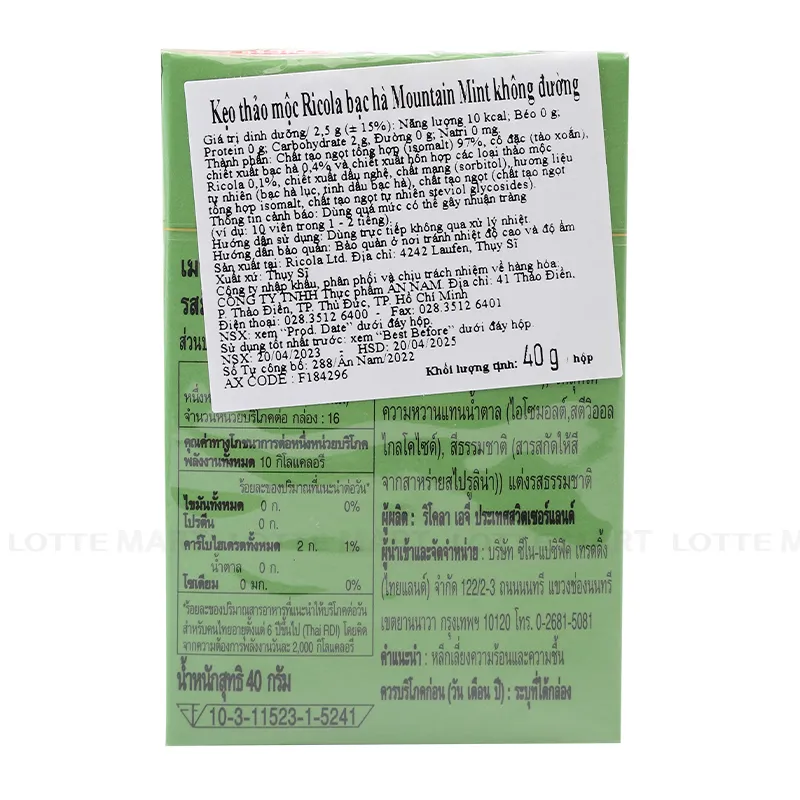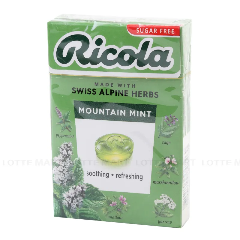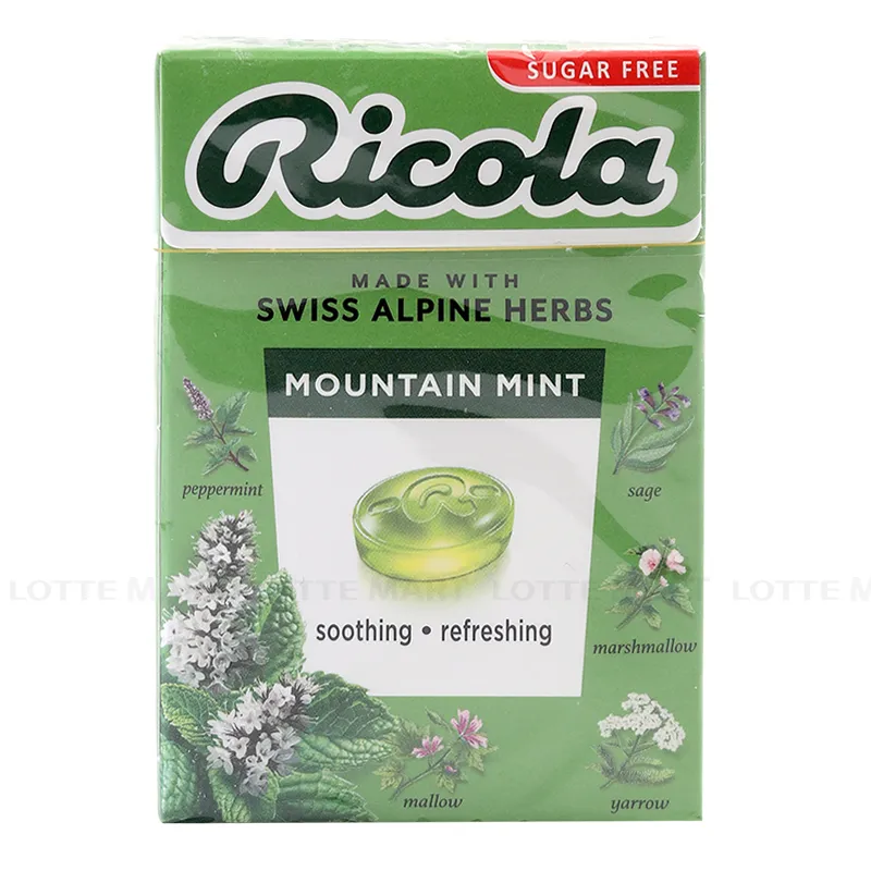 - Kẹo Thảo Mộc Ricola Bạc Hà Mountain Không Đường Hộp 40G được nhập khẩu chính hãng từ Thụy Sỹ. Kẹo với hương vị thảo mộc tự nhiên cay nhẹ và the mát có khả năng đẩy lùi những cơn ho dai dẳng hay cảm giác đau rát cổ họng hiệu quả. Đây là loại kẹo ngậm không chứa đường (sugar-free) nên rất phù hợp với những người đang giảm cân hoặc giữ dáng.
