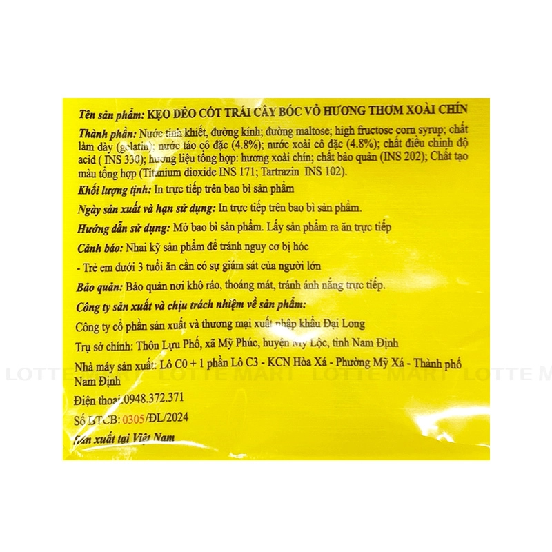 - Kẹo Xoài Chín Bóc Vỏ Đại Long Túi 300G là dòng kẹo dẻo với 2 lớp với lớp ngoài dai dai và lớp trong dẻo dẻo như thạch pudding.