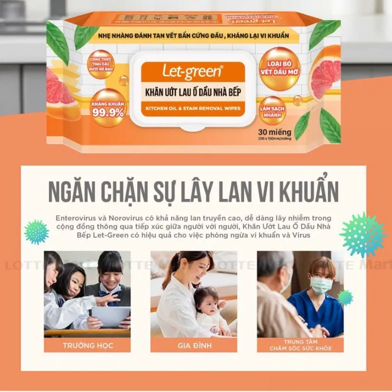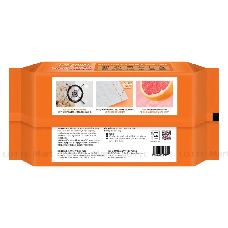 Khăn Ướt Lau Bếp Let-green Gói 30 Miếng giúp lau sạch dầu mỡ, vết ố bám lâu ngày trên bếp. Thích hợp sử dụng lau chùi vệ sinh bề mặt thiết bị và dụng cụ trong nhà: Bếp ga, máy hút khói, lò vi sóng, tủ lạnh, bàn ăn,....