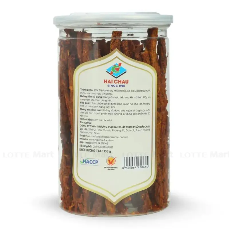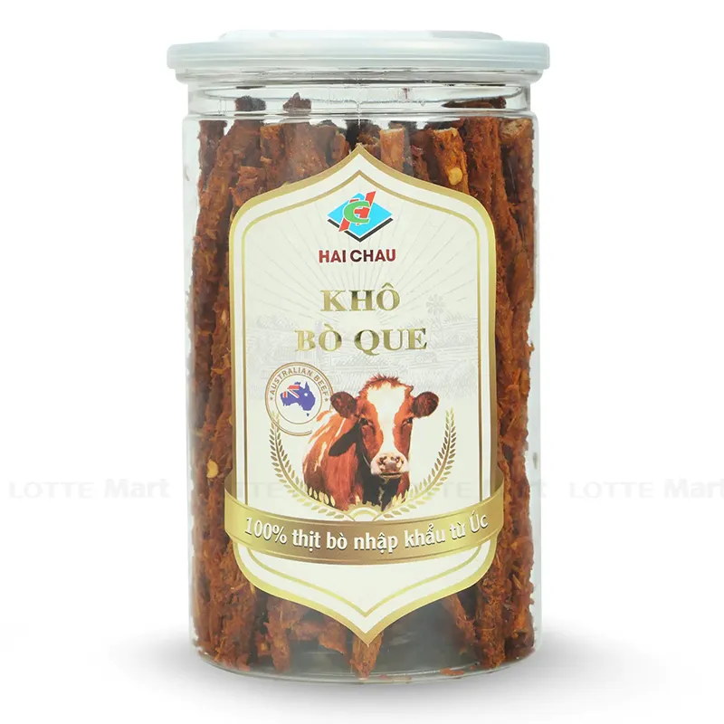 - Khô Bò Que Hải Châu Hộp 135G là sản phẩm sạch không hóa chất, không phẩm màu và không chất bảo quản nhằm phục vụ cho khách hàng. Khi sản xuất và chế biến sản phẩm, Hải Châu luôn lựa chọn những miếng thịt bò Úc với độ béo và độ mềm mại vừa phải nấu chín cùng những gia vị tươi ngon như ớt, tỏi, sả.