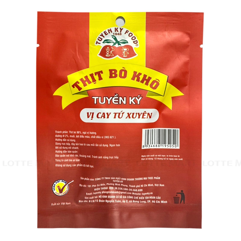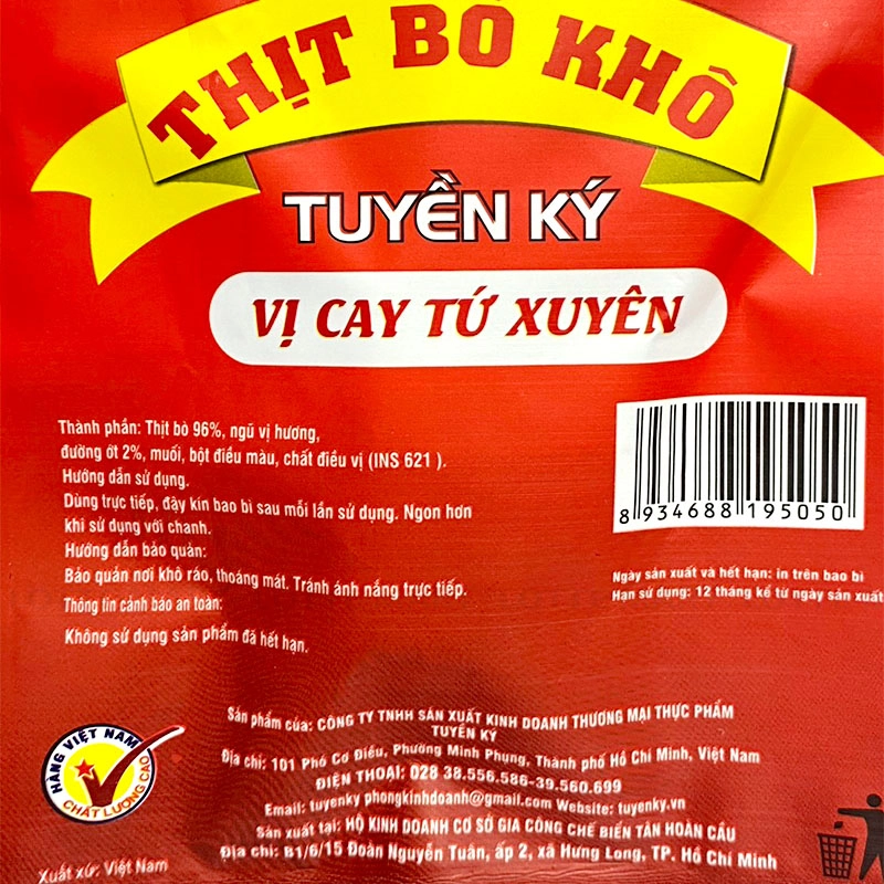 Thịt bò khô của thương hiệu Tuyền Ký được sản xuất trên dây chuyền hiện đại, khép kín giúp cho sản phẩm giữ nguyên hương vị và chất dinh dưỡng từ thịt bò tươi. Thịt bò khô được tẩm ướp vị cay Tứ Xuyên thơm ngon, hấp dẫn, kích thích vị giác, giúp cho món ăn trở nên ngon miệng hơn.