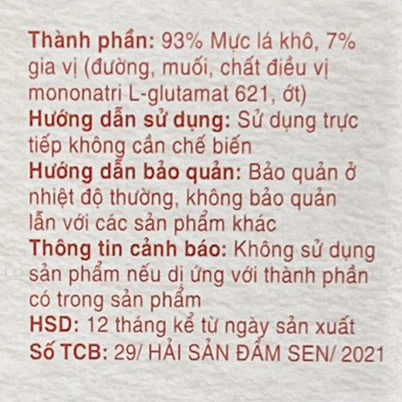 Khô mực xé tẩm gia vị có thành phần chính: 93% Mực lá khô, 7% Gia vị, đường, muối, ớt, bột ngọt. Khô mực xé tẩm gia vị vừa ngon, vừa tiện lợi, nên đã trở thành một món quà ý nghĩa không thể thiếu cho người thân, bạn bè, đồng nghiệp trong những dịp lễ tết. Sản phẩm được sản xuất theo công nghệ hiện đại và dây chuyền khép kín nên giữ lại toàn bộ các chất dinh dưỡng.