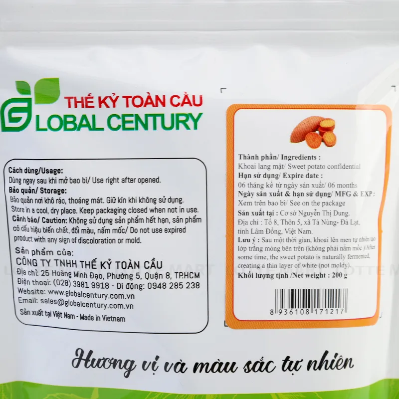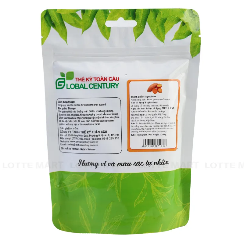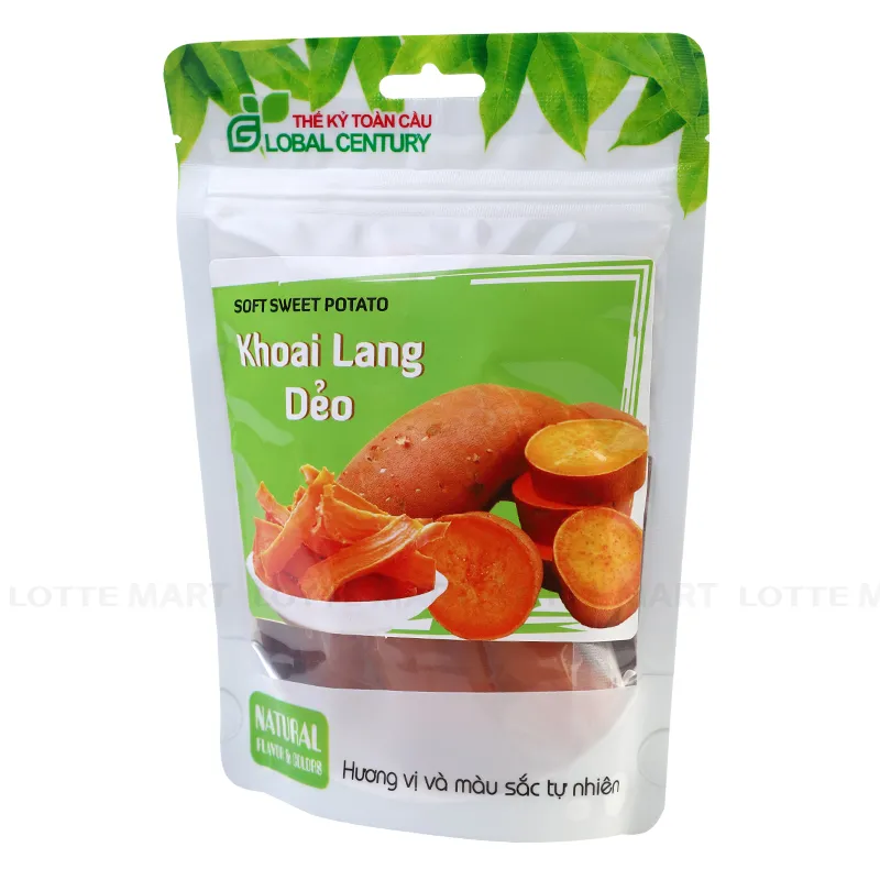 - Khoai Lang Thế Kỷ Toàn Cầu Sấy Dẻo Gói 200G gồm miếng khoai lanh sấy thơm ngon, được lựa chọn tươi ngon, đem đi sấy dẻo, khi ăn có vị dẻo và dai, ngọt thanh hài hòa. Sản phẩm thích hợp làm món ăn vặt thơm ngon hoặc làm nguyên liệu làm bánh.