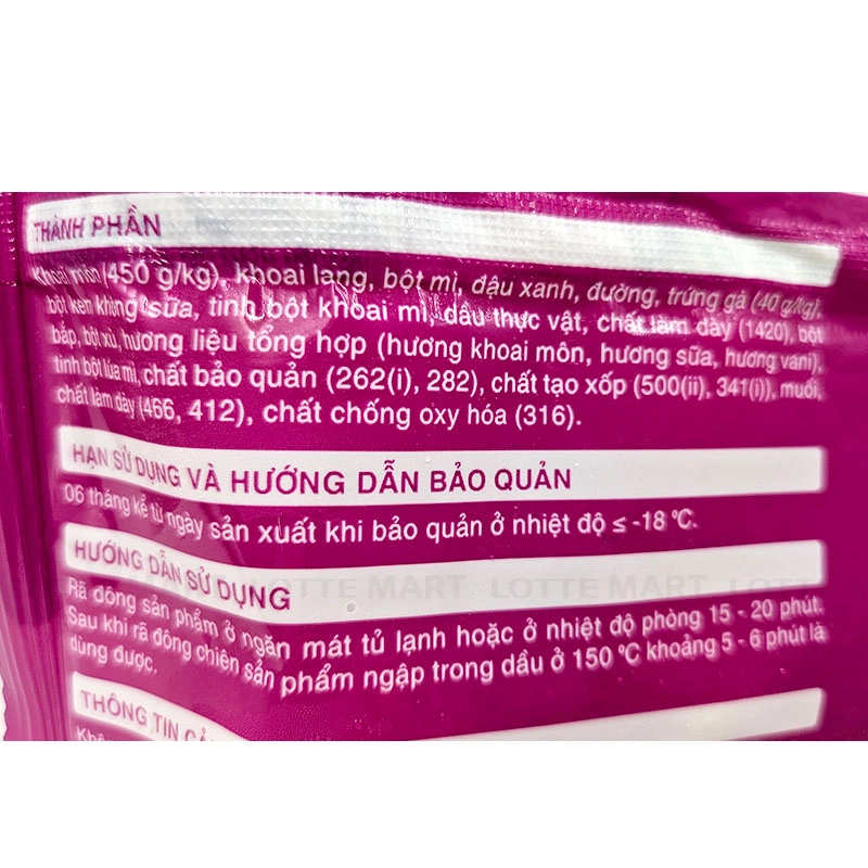 - Khoai môn, khoai lang, bột mì, đậu xanh, đường, trứng gà, bột kem không sữa, tinh bột khoai mì, dầu thực vật, chất làm dày (1420), bột bắp, bột xù, hương liệu tổng hợp (hương khoai môn, hương sữa, hương vani), tinh bột lúa mì, chất bảo quản (362(i), 282), chất tạo xốp (500(ii), 341(i)), muối, chất làm dày (466, 412), chất chống oxy hóa (316).