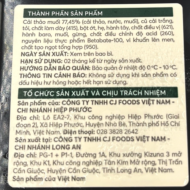 Thành phần: Cải thảo (85%), củ cải trắng, tỏi, ớt bột, hành tây, đường, nước mắm, muối, gừng, hành lá, chất điều vị (621). Hướng dẫn sử dụng: Ăn ngay hoặc chế biến thành các món tùy thích. Bảo quản: ở nhiệt độ từ 5° - 15°C.
