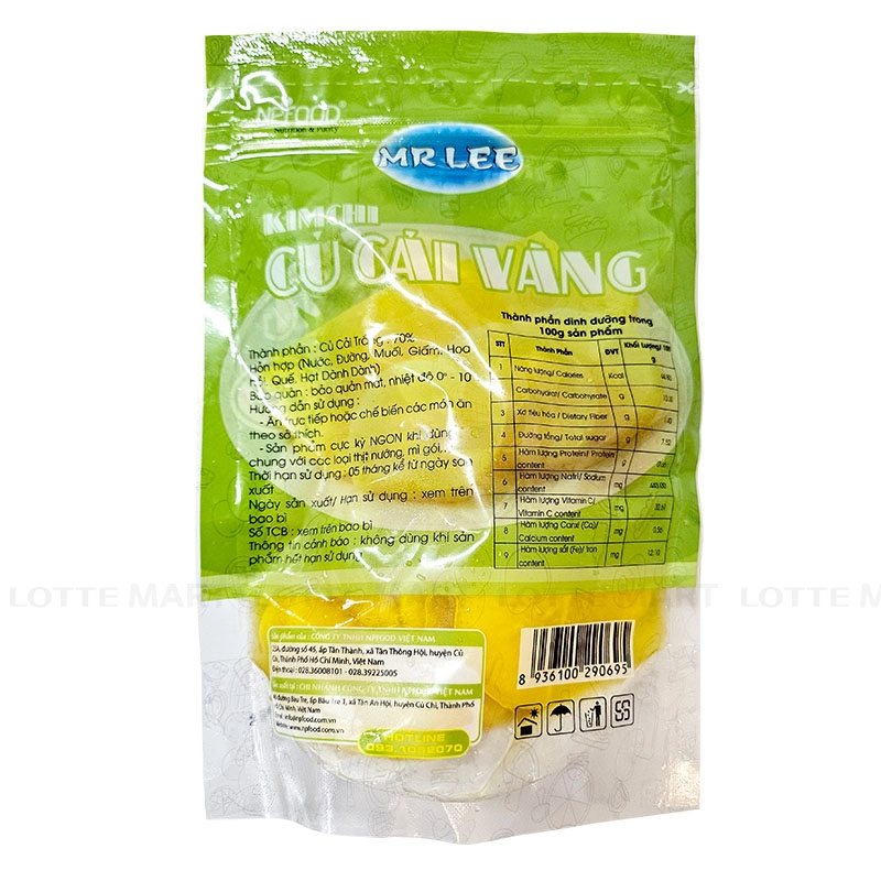 - Kim Chi Củ Cải Vàng Mr Lee được chế biến từ củ cải trắng muối, mang đến vị chua ngọt tự nhiên, giòn giòn hấp dẫn. Đây là món ăn kèm phổ biến trong ẩm thực Hàn Quốc, giúp tăng thêm hương vị cho bữa ăn. Sản phẩm được sản xuất tại Việt Nam theo công thức chuẩn Hàn Quốc, đảm bảo an toàn thực phẩm.