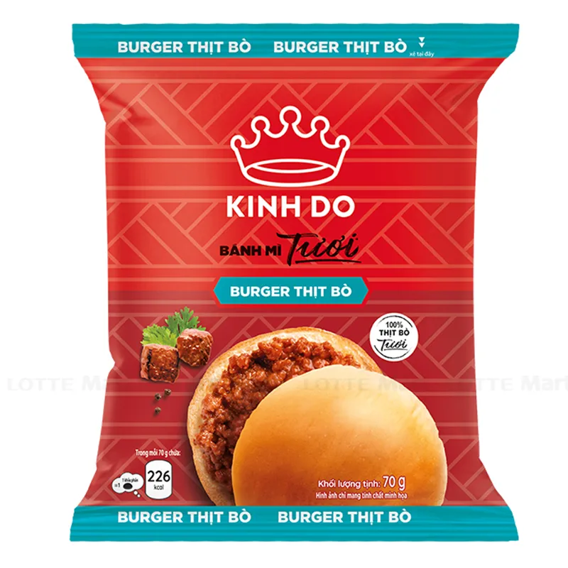 Bánh Mì Burger Tươi Kinh Đô Nhân Thịt Bò là sản phẩm ăn nhanh chất lượng cao được sản xuất tại Việt Nam. Bánh được sản xuất theo công thức đặc biệt mang đến hương vị thơm ngon, hấp dẫn từ những thành phần chính như: bột mì, bột biến tính, bột sữa, thịt bò, trứng gà, men, bột gia vị bò kho...