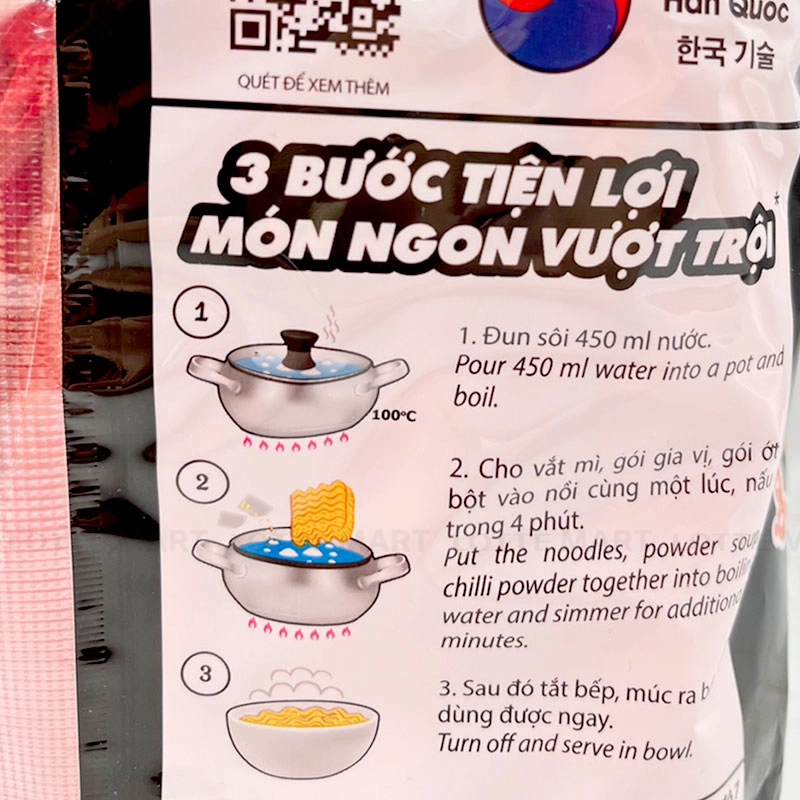 - Đun sôi 450ml nước, cho vắt mì, gói rau, gói ớt bột vào nồi cùng một lúc và nấu trong 4 phút, sau đó tắt bếp và thưởng thức.