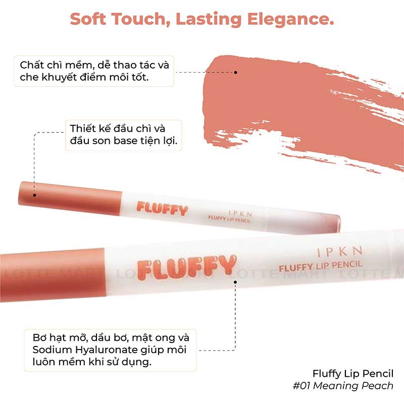 - Chì Kẻ Viền Môi Hai Đầu IPKN Fluffy Lip Pencil #01 Meaning Peach thiết kế đầu cọ mảnh cho phép vẽ viền môi một cách tinh tế và tạo hiệu ứng màu lan tự nhiên như khi sử dụng son cushion.