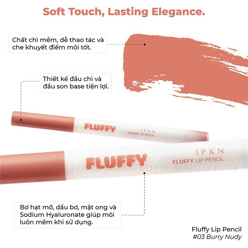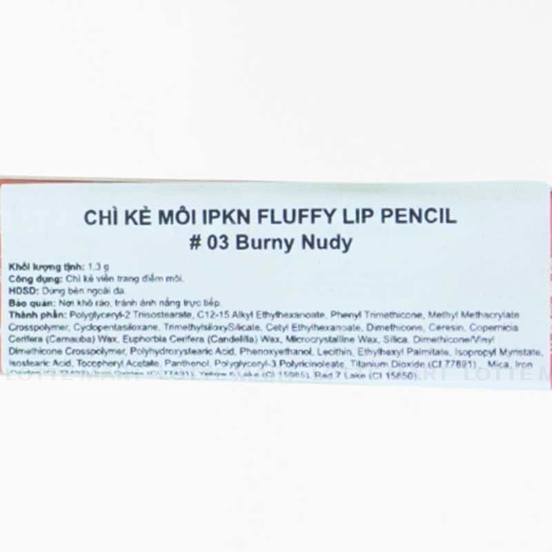 - Chì Kẻ Viền Môi Hai Đầu IPKN Fluffy Lip Pencil #03 Burny Nudy thiết kế đầu cọ mảnh cho phép vẽ viền môi một cách tinh tế và tạo hiệu ứng màu lan tự nhiên như khi sử dụng son cushion.