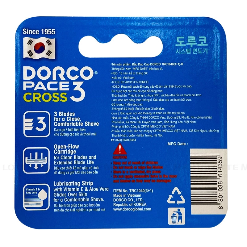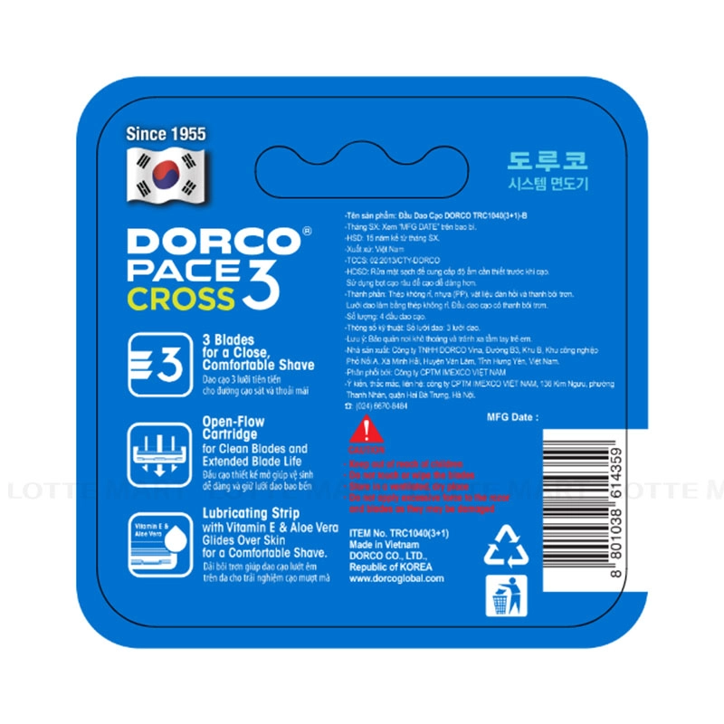 Sản phẩm bao gồm 4 đầu dao thay thế chuyên dụng cho dòng cán Dorco Pace 3 Cross, giúp bạn làm mới bộ dụng cụ cạo râu một cách dễ dàng và tiết kiệm.