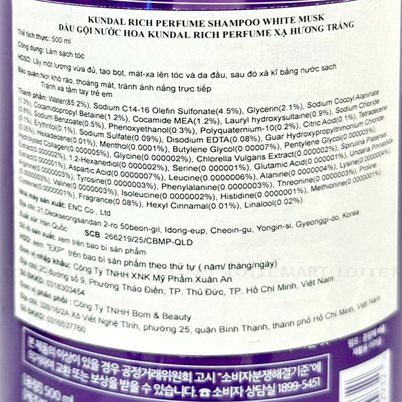 Dầu Gội Kundal Rich Perfume White Musk là dòng sản phẩm chăm sóc tóc, nổi bật với hương nước hoa white musk tinh tế, mang lại cảm giác sang trọng, cuốn hút.